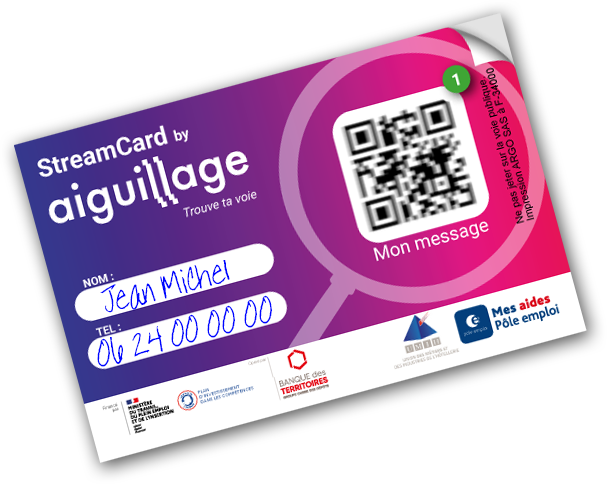 Pour cela nous parions sur un autocollant, la streamcard, permettant de coller sa vidéo n’importe où, pour notamment se présenter à un futur employeur, simplement, sans CV ni lettre de motivation.